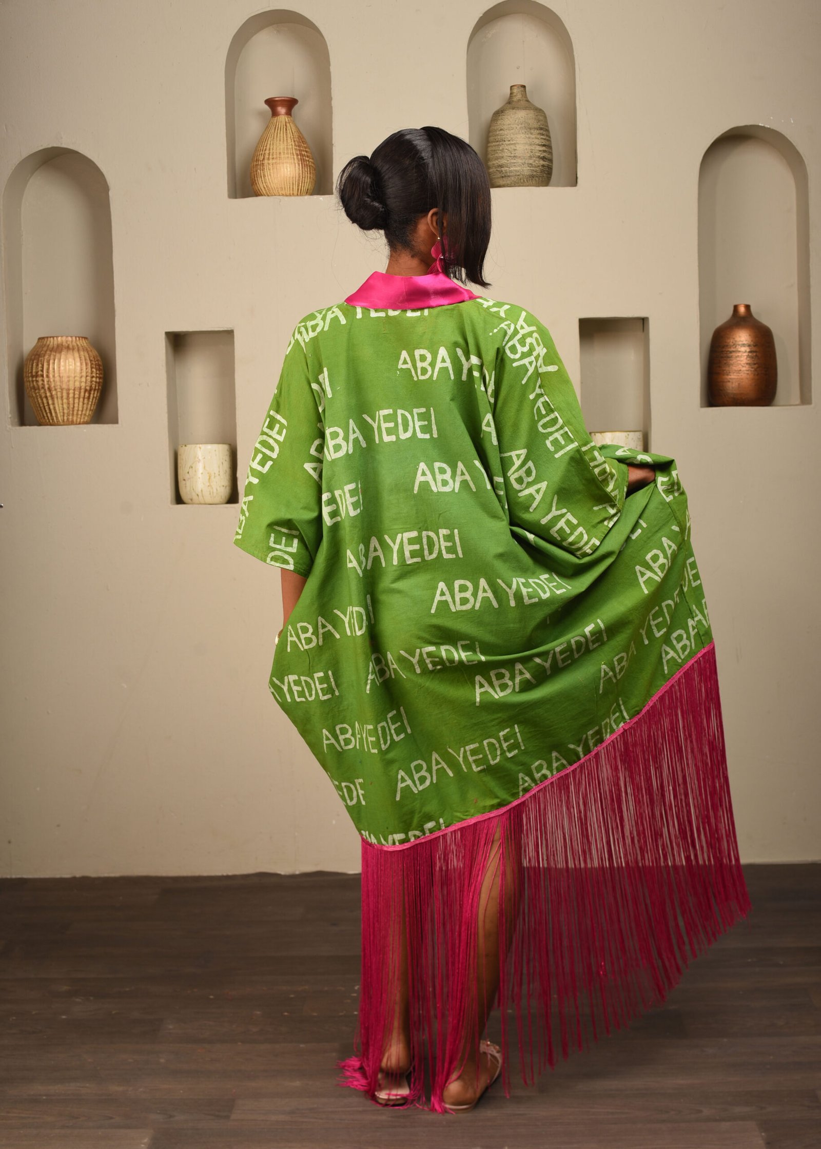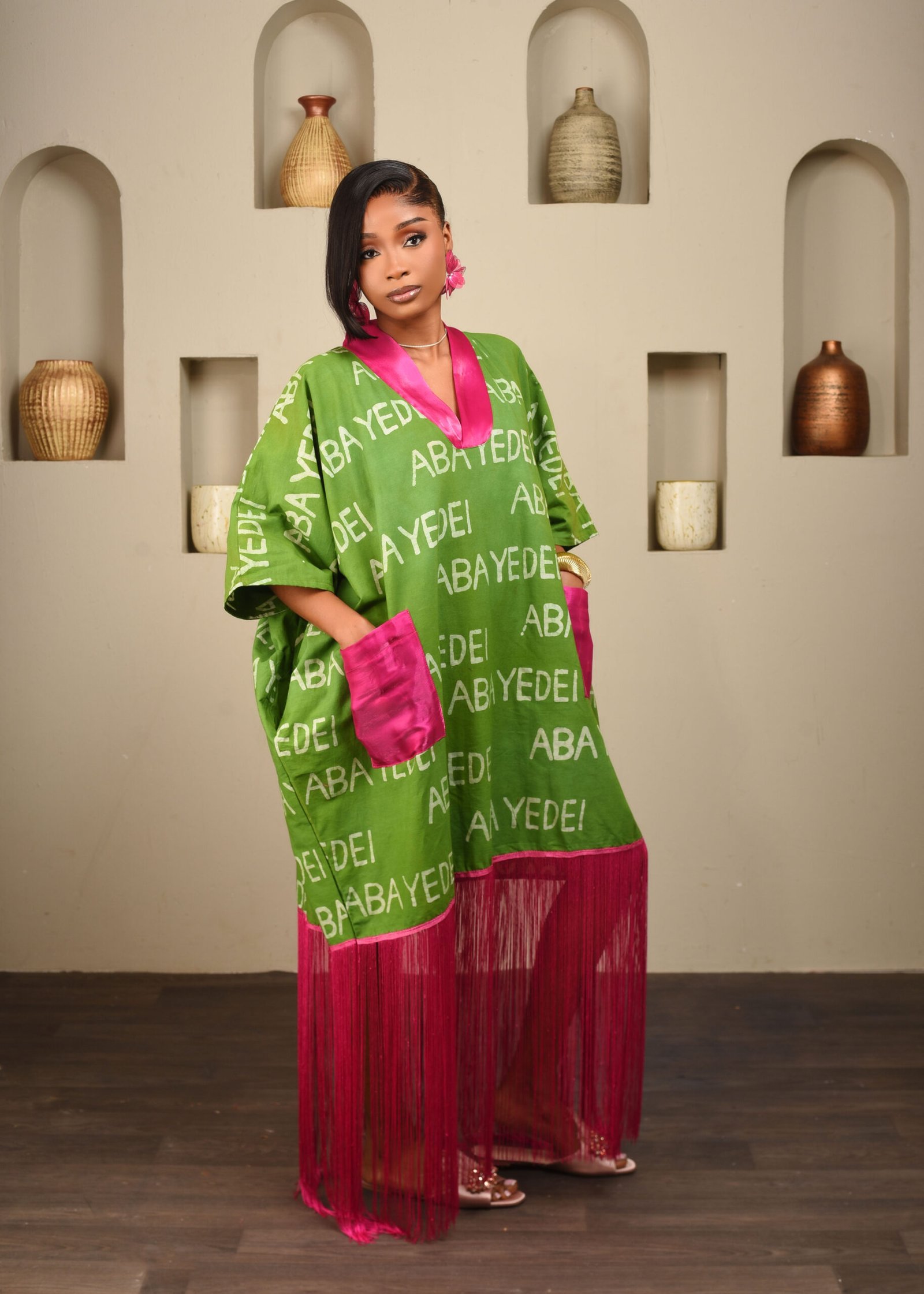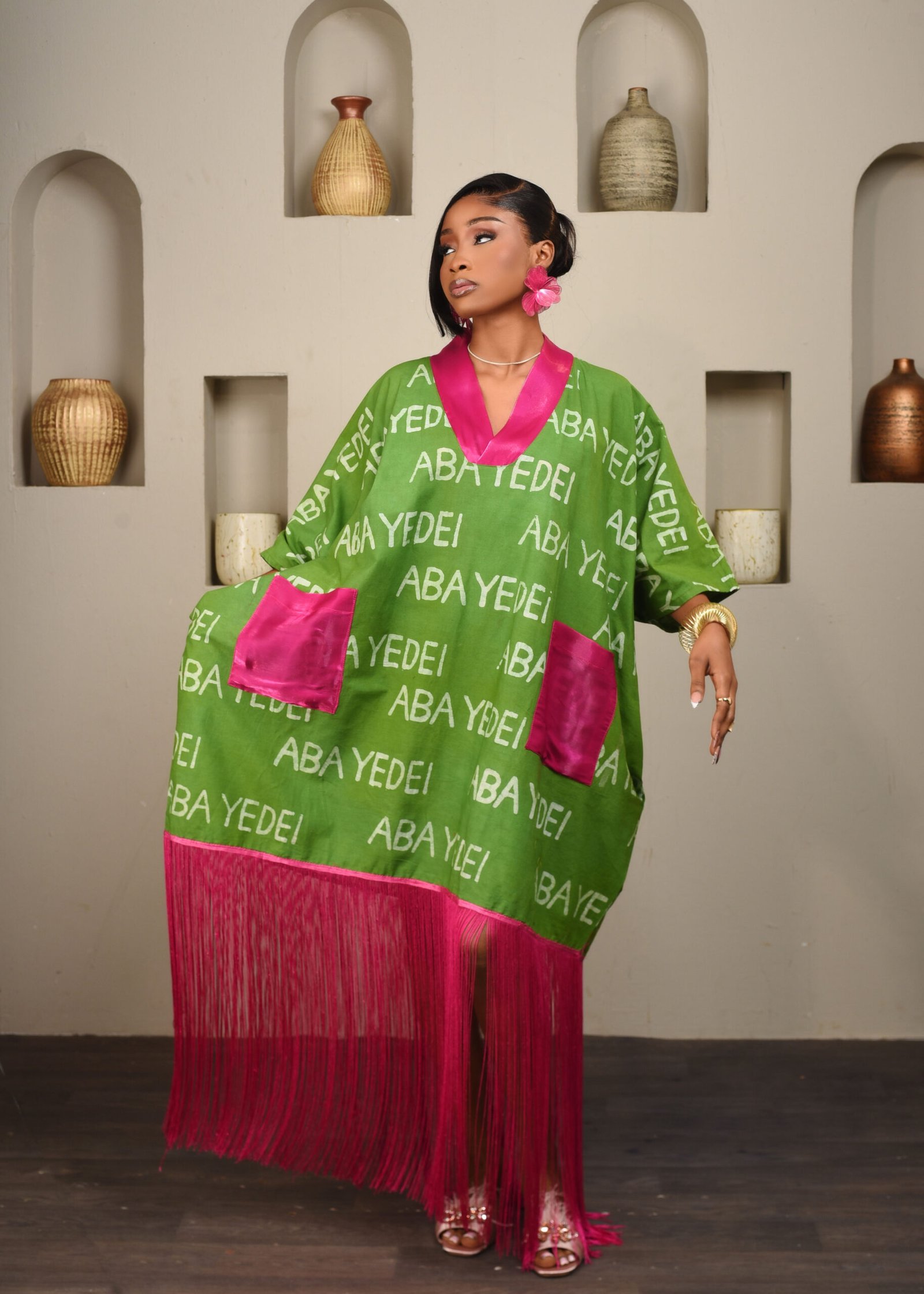Featuring a chartreuse green aba yedei labeled kaftan dress with rose pink fringe detail