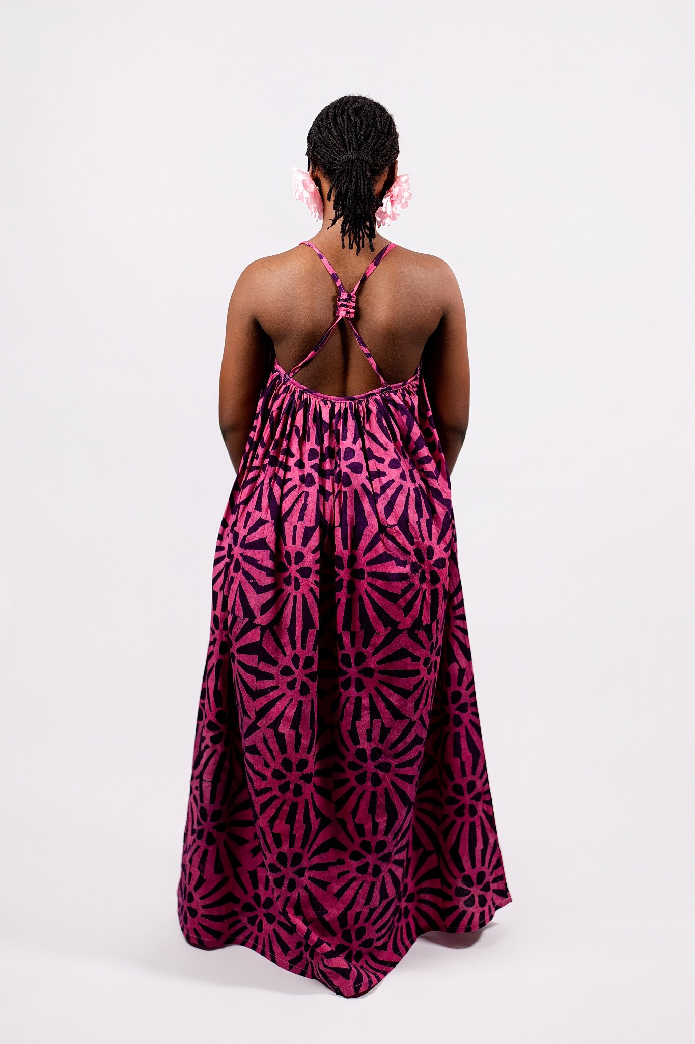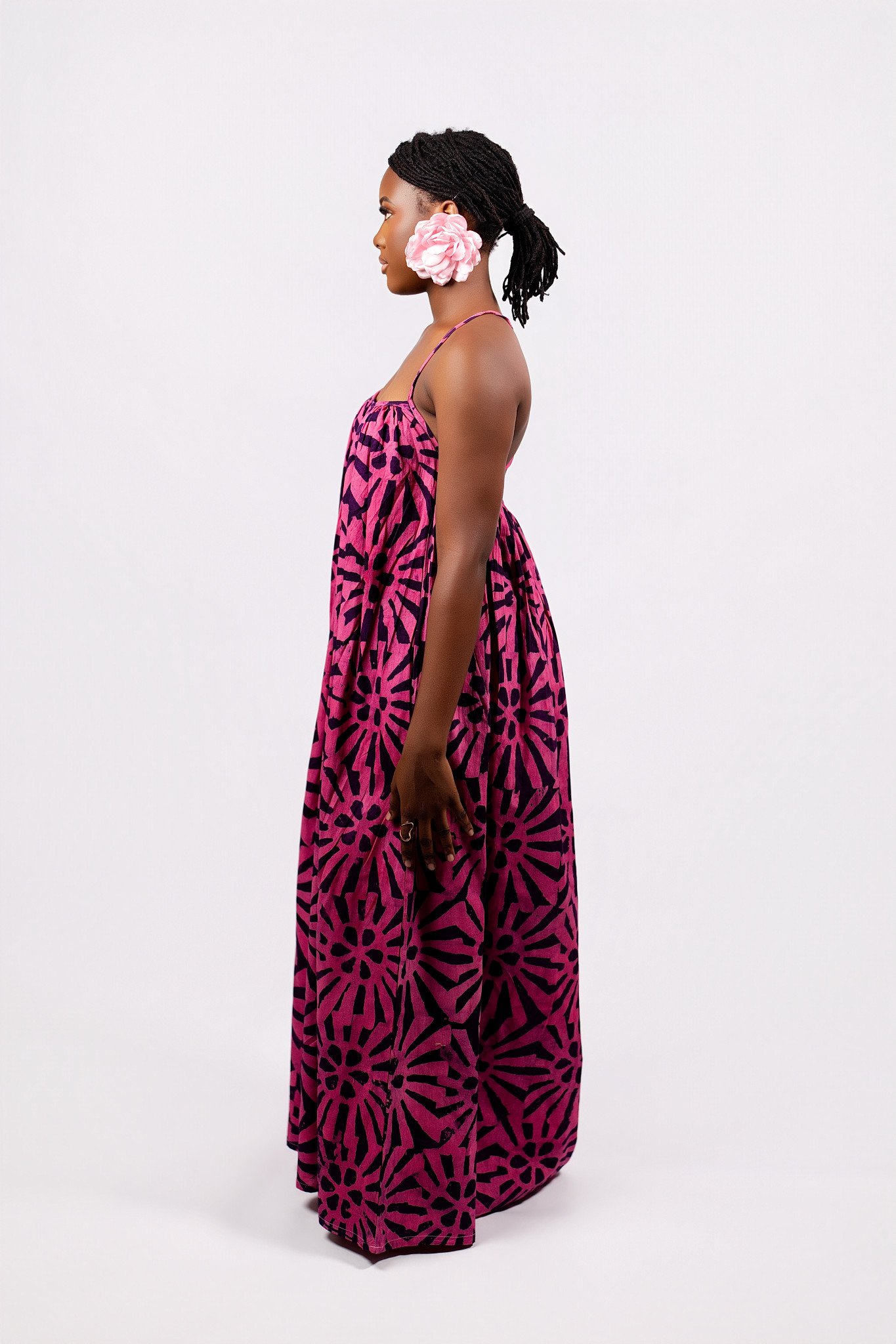 Crafted in a vibrant fuchsia-pink batik with bold black sunburst motifs,