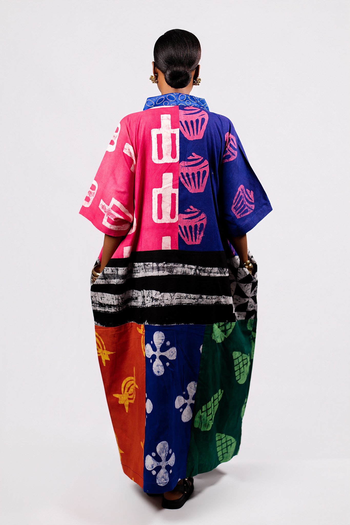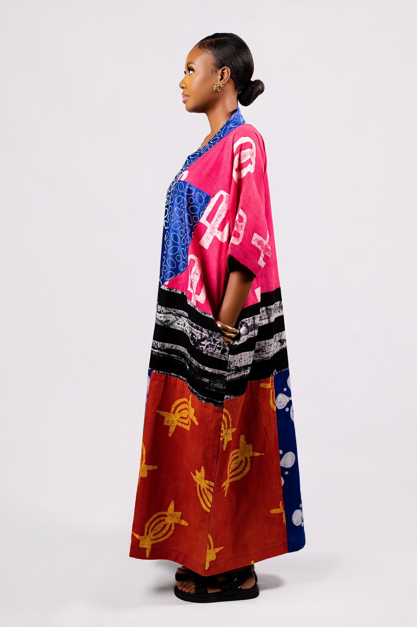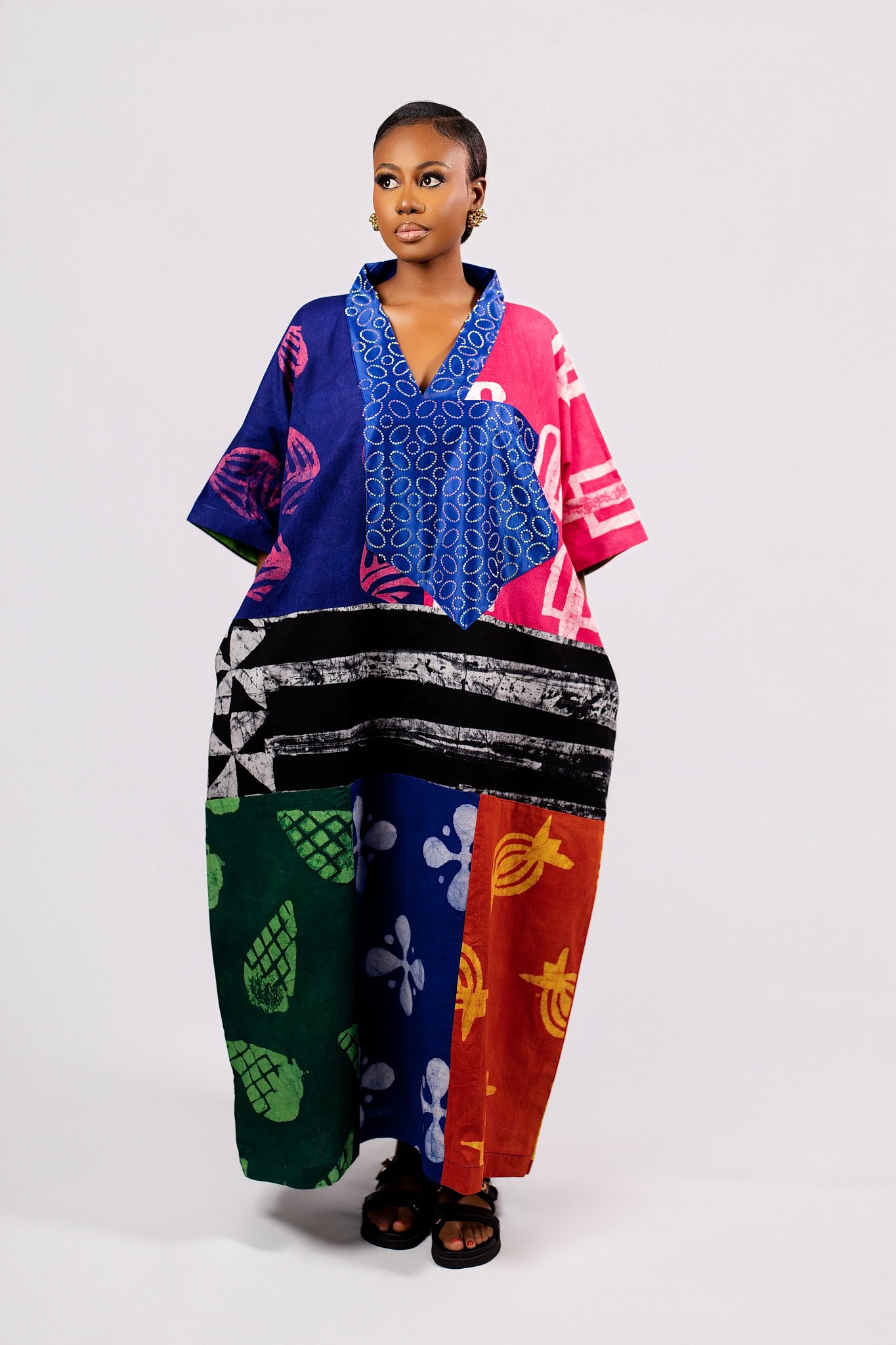 THIS boubou is a real eye‑catcher! It’s a vibrant, patchwork outfit made of several colorful